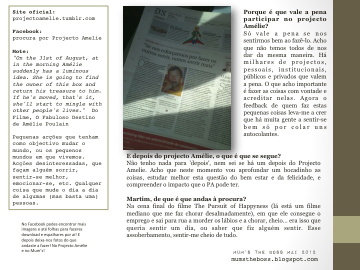 E foi com uma felicidade imensa que descobri o Projecto Amélie. Caí-me de amores pelo nome, pelas ideias e pelas fotos e quis saber mais sobre quem é que anda a contagiar Portugal com cenas que nos aquecem o coração e nos colam um sorriso no olhar!