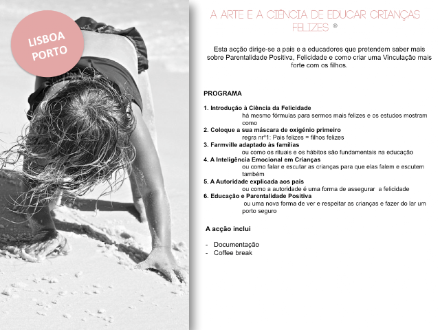 Obrigada, Magda, por todos os ensinamentos (muitos deles tão simples) e por nos ajudar a pensar em determinados assuntos por ângulos diferentes e mais positivos. Sou uma mãe mais calma, mais paciente e mais criativa desde que a parentalidade positiva entrou na minha vida. E tenho posto em prática o que falámos na sessão de coaching sobre a chegada do mano - que é esperado a qualquer momento!!! - e até agora a reacção do mais velho não podia ser melhor.